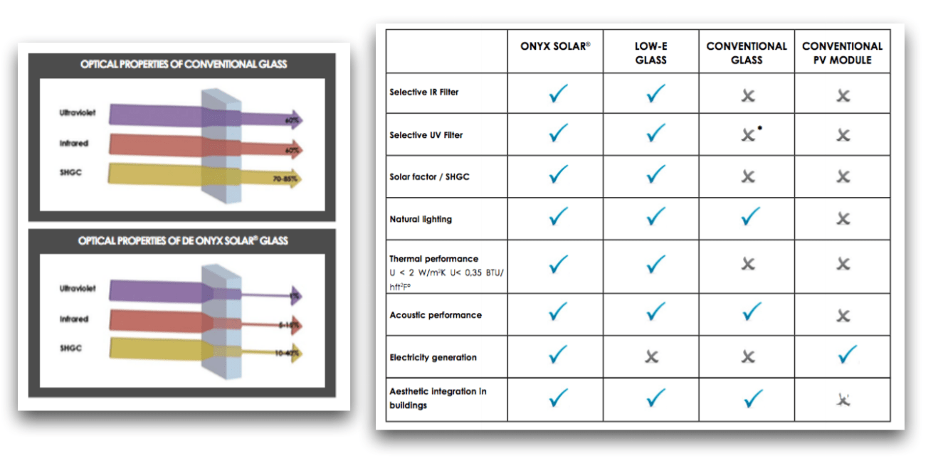 Onyx Solar can customize the photovoltaic glass to supply it in different sizes, colours and degrees of transparency. These characteristics mean that it is the ideal material for installation as a photovoltaic curtain wall.